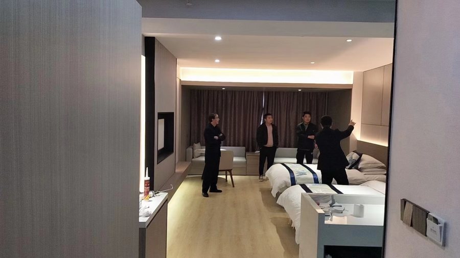 該項(xiàng)目的酒店客房委托西安博菲克集團(tuán)管理有限公司所屬的設(shè)計(jì)部、裝修部、家具廠總包負(fù)責(zé),設(shè)計(jì)部出客房效果圖,裝修部門抵達(dá)子洲縣進(jìn)行施工,酒店家具廠根據(jù)效果圖制作家具,一站式服務(wù),軟硬裝一方全包,無扯皮現(xiàn)象,客戶只等驗(yàn)收。